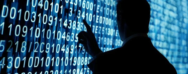 A man standing and looking at a screen displaying various numbers, analyzing data or information