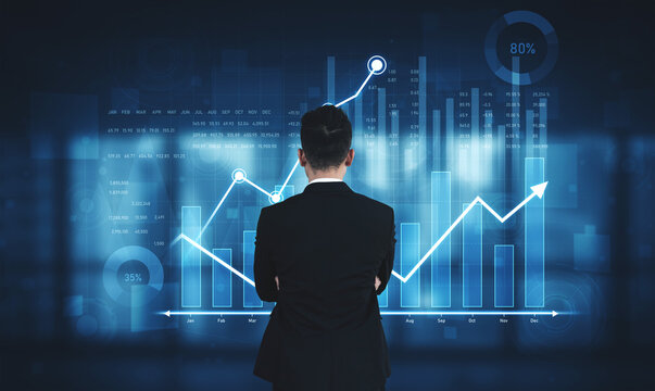 A businessman stands before digital financial data visualization, analyzing trends and metrics. This image captures the essence of modern data-driven decision making in corporate environments. Scalp