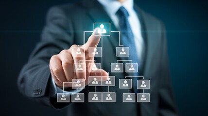 A professional business person interacting with a digital interface displaying a hierarchical structure of people icons