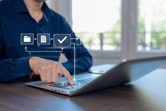 Digital workflow and process automation concept with approval, verification, and system integration icons. Professional using laptop to manage documents, validation steps, and secure business operatio