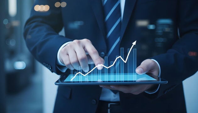 A businessman in a suit uses a tablet to illustrate a rising growth graph, indicating success in a corporate setting