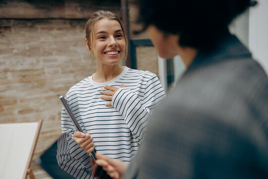 Portrait of Two Creative Colleagues Collaborating and Pointing at the Computer in Modern Office. Biracial Female Manager Consults Male Projects Manager, They Brainstorm on the Project.