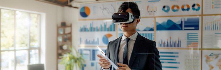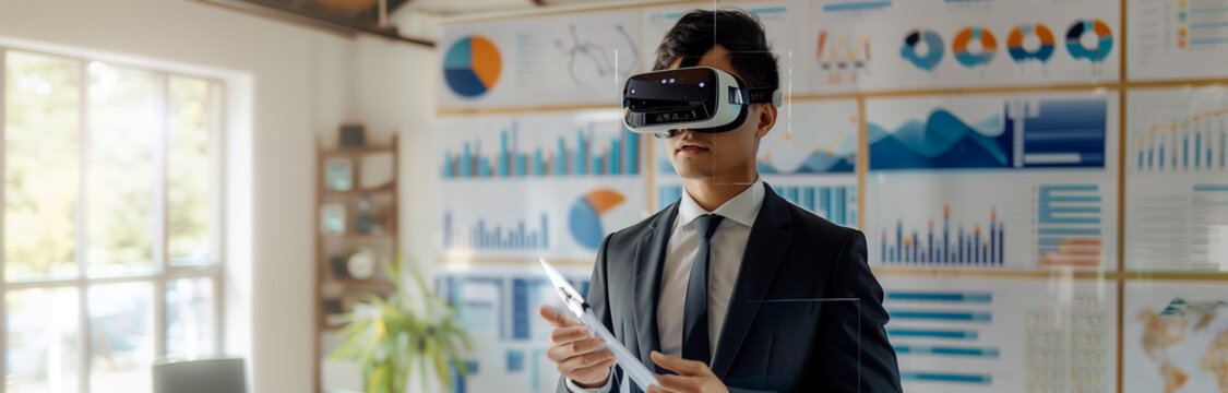 A Business Analyst Utilizing Virtual Reality Glasses in Front of an Interactive Data Dashboard with Colorful Charts and Graphs Displayed