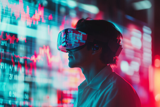 Trader utilizing virtual reality technology in a dimly lit room for analyzing market trends and data at night