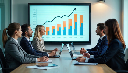 Business professionals sit in meeting room. Actively analyze financial projections displayed on large screen. Growth strategies, future business plans discussed. Teamwork evident. Modern office