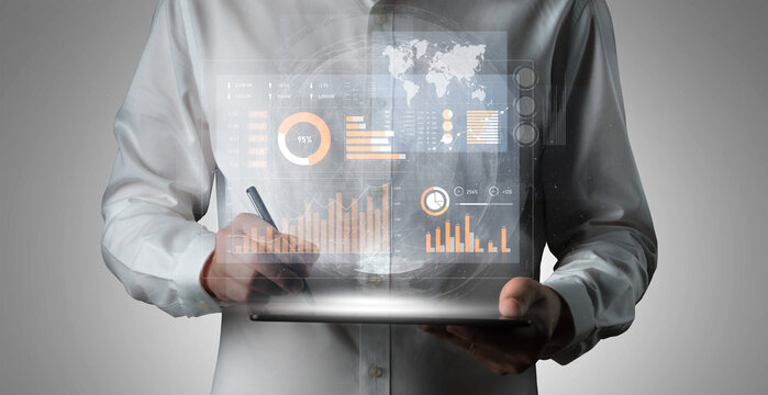 A businessman stands in an urban environment analyzing financial data on a tablet. Digital graphs and charts display trends and insights, symbolizing modern business analytics. Scalp