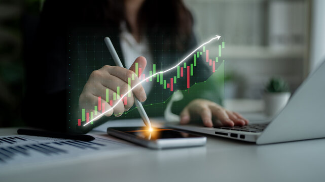 A business professional analyzes financial data on a tablet in a modern office. A digital graph illustrates growth trends, emphasizing technology and innovation in finance. Impute