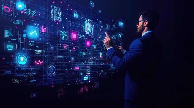 A professional analyzing digital data on a futuristic interface, showcasing technology and innovation in a business environment.