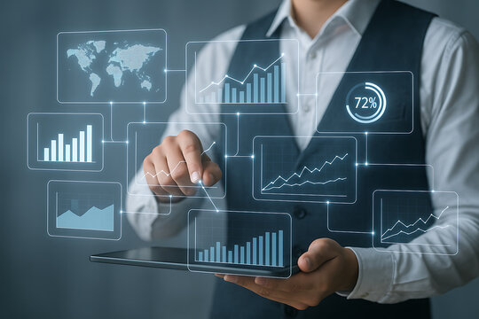 Interactive data analysis presentation by a professional holding a tablet, with overlaid holographic charts, graphs, and a world map illustrating comprehensive business intelligence insights