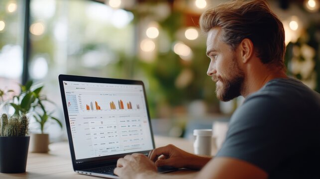 A focused man analyzing business data with colorful graphs on his laptop screen in a dynamic, modern workspace, evoking a spirit of innovation and strategy.