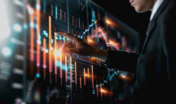 A businessman presents a holographic growth chart, symbolizing success and investment in the market