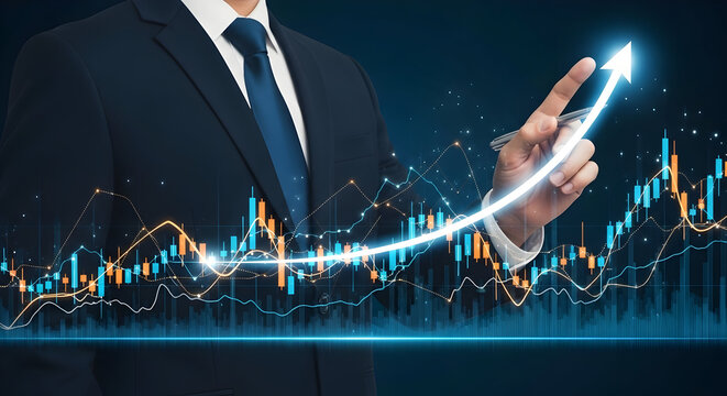 Businessman in Suit Analyzing Financial Data with Digital Graphs and Charts Showing Growth and Success in Stock Market Investment and Trading Strategies