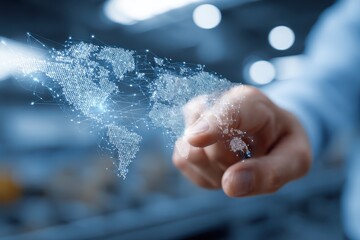 A professional's hand illuminates a global network map, symbolizing worldwide business and technological advancement.