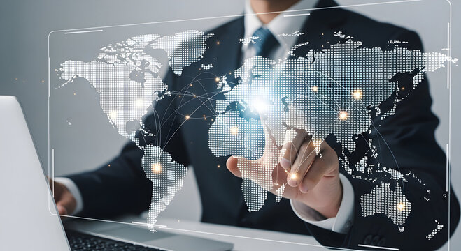 A man in a suit interacts with a digital world map display, analyzing global data and statistics on a dark screen.