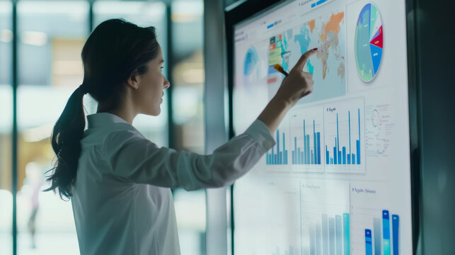 A professional woman in a white shirt taps on a large screen filled with colorful charts and graphs, analyzing global data in a modern office.
