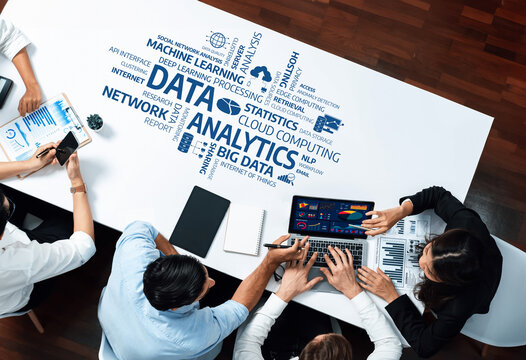 Professionals collaborate in a modern office setting, focusing on data analytics and statistical analysis through charts, reports, and teamwork to drive business success. Amity