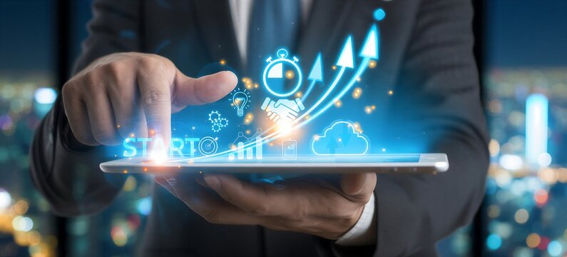 Finger interacting with a glowing holographic upward arrow, signifying robust business growth and financial progress, surrounded by various data visualization icons in a modern office setting.