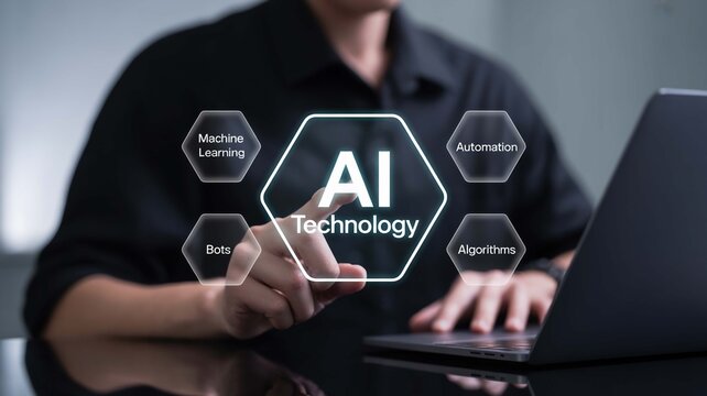 Innovative professional engaging with AI technology interface featuring machine learning, automation, bots, and algorithms for future business solutions