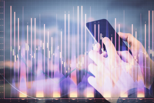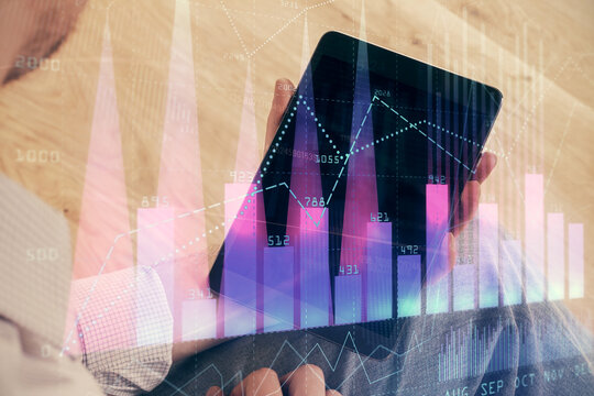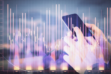 Double exposure of man's hands holding and using a digital device and forex graph drawing. Financial market concept.
