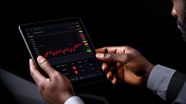 Data Driven Decisions: A woman's hands expertly navigate a digital tablet displaying dynamic stock market charts, highlighting the intricate dance of finance. The image captures the focus, precision.