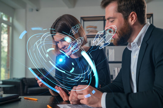 Business Professionals Using Holographic Interface For Data Analysis Images