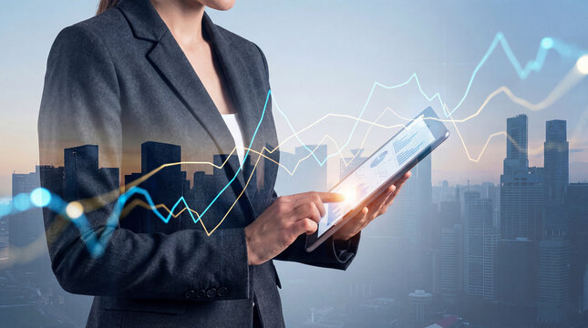 Accountant using calculator with digital financial charts and stock market growth graphs overlay