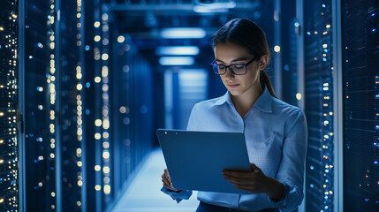 A focused female Chief Technology Officer in a big data center, utilizing her laptop to engage servers, signaling the beginning of information digitalization in a modern warehouse.