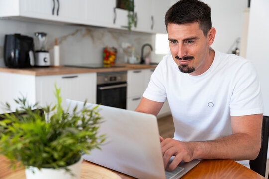 Young man concentrating on laptop, working from home in modern kitchen, utilizing technology for freelance remote productivity and digital nomad lifestyle
