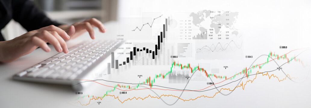 A close-up view of hands typing on a keyboard, overlayed with financial graphs and stock market data to depict the concepts of investment analysis and business growth. Scalp