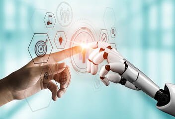 A human hand reaches towards a robotic hand, symbolizing the future of technology and cooperation through digital interface and glowing data visualization elements. Gantry