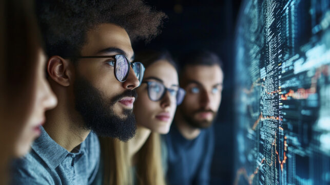 A team of IT professionals working on big data transformation, analyzing trends and insights to improve business operations.