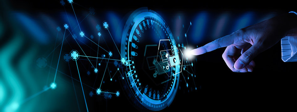 Artificial intelligence brain with glowing neon connections to cloud computing data security and user interface icons in a modern office setting