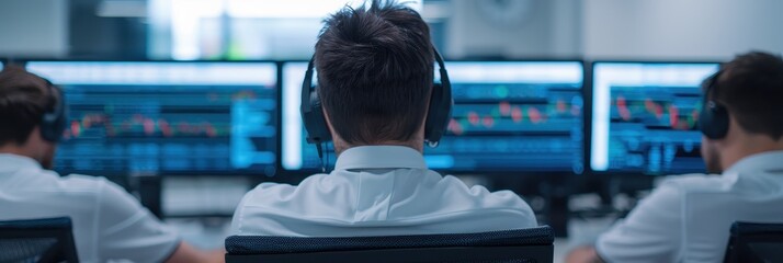 Three financial traders with headsets monitor live stock market data displayed on multiple screens, analyzing market trends in an office setting.