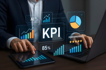 Professional Data Analyst in Corporate Suit Interacting with Futuristic Holographic KPI Dashboards, Business Analytics, and Technology for Digital Strategy