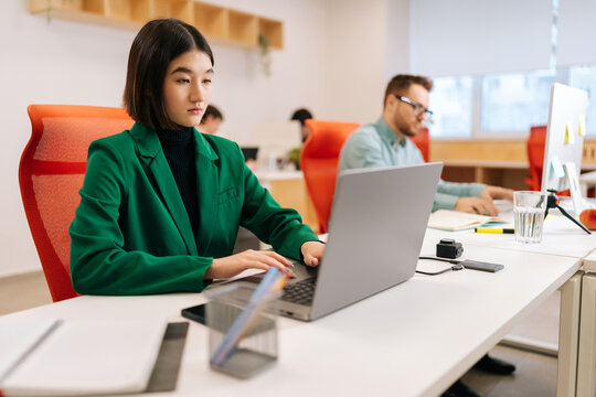 Modern corporate office open space with busy male and female staff employees using laptop computers sitting at work in big modern corporate office. Startup team working together at creative open space
