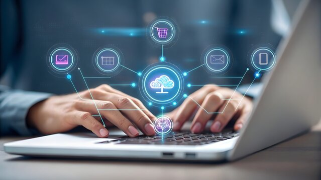 Man holding holographic icons for business technology concept, including cloud computing, data security, team collaboration, and performance analytics for digital transformation strategy.