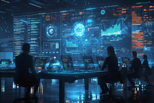 Strategic Data Analysis: Professionals collaborate over a sophisticated digital interface, delving into intricate data visualization and strategic planning within a modern technological environment.
