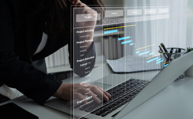 A business professional interacts with a laptop showcasing project management software featuring a Gantt chart, illustrating advanced workflow and planning efforts in a modern workspace. Tessel