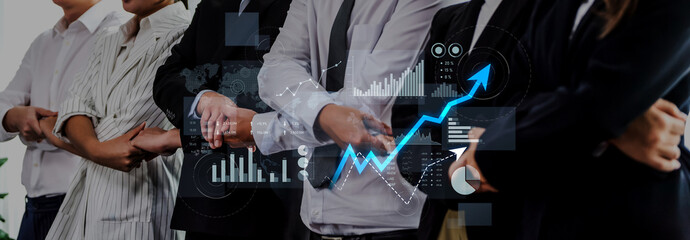 Business Team Collaboration Analyzing Connected Line Graphs. Data Management, Financial Growth, and Success Visualization.