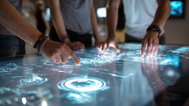 Startup team collaborating around futuristic touchscreen table with holographic display
