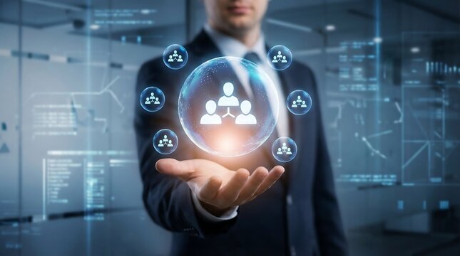 Digital HR system interface showing user profile, team icons, and data dashboard. Businessman managing personnel or customer information via online platform at workspace.