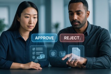 Decision-making process approve or reject business proposal in office environment digital interface professional viewpoint