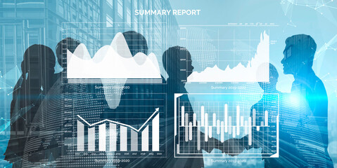 A business team engages in a collaborative meeting, reviewing a summary report with various visual data elements like graphs and charts that illustrate key metrics and analytics. Impute