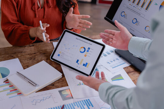 Marketing team analyzing sales performance chart on tablet during a meeting, discussing company strategy and evaluating marketing effectiveness using data visualization tools