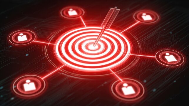Glowing target with a dart at center, surrounded by interconnected user icons, set on a dark tech-inspired background
