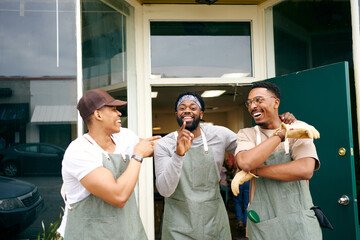 Diverse warehouse workers celebrating success with financial growth charts overlay