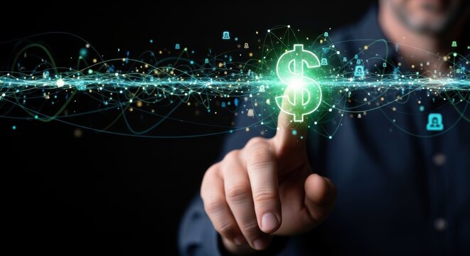 Businessman finger touching glowing green digital dollar sign amidst data stream and security locks for fintech concept