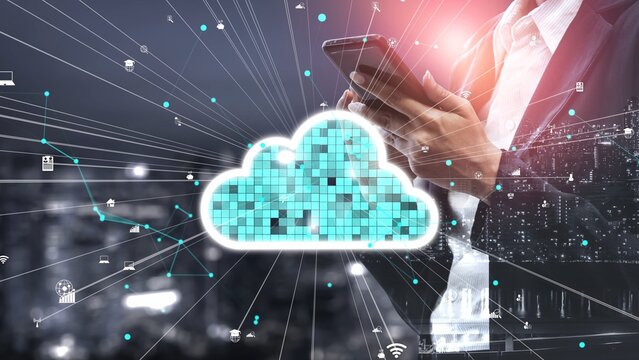 A businessman in a suit uses a smartphone amidst a blend of cloud technology and data flows, symbolizing the integration of communication and innovation in urban settings. Gantry