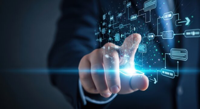 A businessman in a suit interacts with a futuristic digital interface, highlighting innovation and technology. The glowing elements depict data analysis and advanced connectivity.