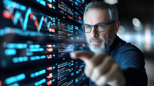 Businessman analyzing data trends digital screen, showcasing advanced technology and analytics